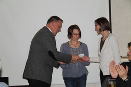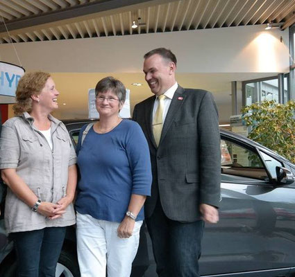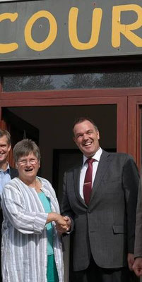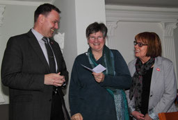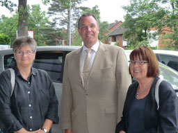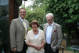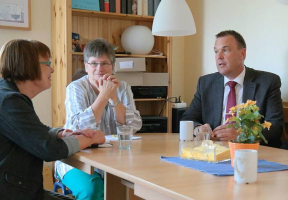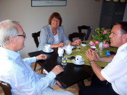 Frau Dr. Constanze Hock-Warmuth, Leiterin des MGH Courage, beim "shake hands" mit Thomas Grambow (links), im Planungsgespräch mit Sylvia Wenig-Karasch und Thomas Grambow (rechts).