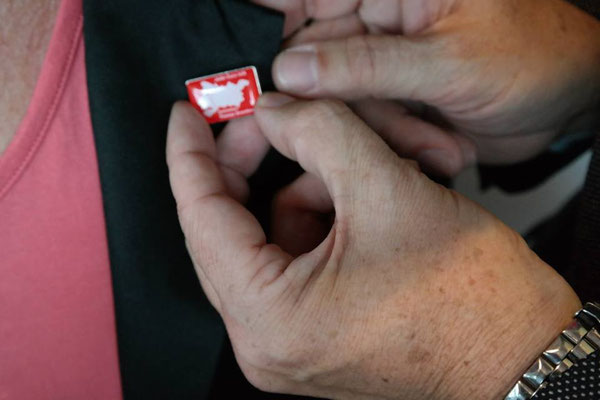 Fotos (von links oben nach rechts unten): Als Erste bekommt JEDER EURO HILFT!-Initiatorin Sylvia Wenig-Karasch den neuen Spendenbutton von Thomas Grambow angesteckt, Dr. Constanze Hock-Warmuth vom MGH Courage und Mitarbeiterin nehmen die Spende entgegen, der Spendenbutton wird ab einer Spende von 5,00 Euro vergeben, im Rahmen des Messe-Info-Abends tragen bereits acht Unternehmen das kleine DANKESCHÖN für die Beteiligung an JEDER EURO HILFT!: Andrea Ringel, Sylvia Karasch, Jürgen Nickel, Mathias Süchting, Christel Nickel, Jens Kähler und Ehefrau, Schirmherr Thomas Grambow, Dirk Ringel.