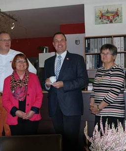 JEDER EURO HILFT!-Schirmherr Thomas Grambow - unermüdlich sucht er nach Wegen, Spenden für Menschen in Not sammeln zu können. So mobilisiert er gemeinsam mit Sylvia Wenig-Karasch in seinem Landrats-Wahlkampf 2014 zahlreiche Geschäftsleute (links im Bild Gaby Hamdorf und Winfried Wrede aus Elstorf), die sich mit verschiedenen Aktionen an der Spendensammlung für Menschen in Not beteiligen.