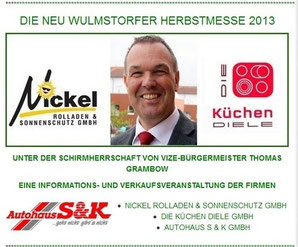 Neu Wulmstorfer Herbstmesse 2013 - 50 (!) Aussteller aus der Region haben zwei Tage lang die kostenlosen Messestände von Nickel Rolladen & Sonnenschutz, der "Küchen Diele" und vom Autohaus S+K genutzt, um sich vorzustellen. Die von Malermeister Dirk Ringel und Familie für JEDER EURO HILFT! organisierte Tombola brachte einen Spendenerlös von rund 3000 Euro.
