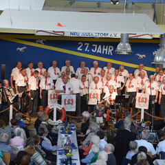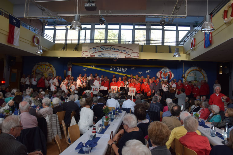 angefangen damit, dass der Neu Wulmstorfer Shanty-Chor DE WINDJAMMERS unter Leitung von Hans Wöbcke (1. Chairman) und Jens Peikert (musikalischer Leiter) es einmal mehr geschafft hatte, gleich vier Chöre aus verschiedenen Regionen terminlich zusammen und gemeinsam auf die Bühne zu bringen! Mehr als 80 Sänger und Musiker(Innen), jede(r) einzelne für sich großartiger künstlerischer Vertreter des Metiers "traditionelle Seemanns-Musik"- ein tolles Renommé auch für die Gemeinde Neu Wulmstorf, mit einer Darbietung dieser Größenordnung aufwarten zu können!