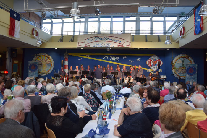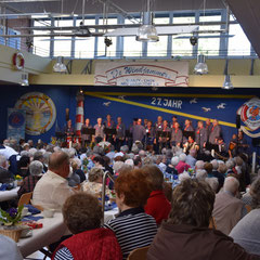 Schon gut eine Stunde vor Beginn des Konzerts war die Aula der Hauptschule Vossbarg voll besetzt bis auf den letzten Platz, mehr als 400 Shanty-Fans hatten sich zu Kaffee, Kuchen und kühlen Drinks eingefunden, um sich durch die Songs der Shanty-"Jungs" (und einer "Deern") in maritime Stimmung bringen zu lassen. Auf der Bühne im Wechsel - (fast) durchgehend von 13 Uhr bis 17 Uhr: die Shanty-Chöre "Lägerdorf", "MC Harmonie aus Steinheim", "Maritiem" aus den Niederlanden und DE WINDJAMMERS aus Neu Wulmstorf.